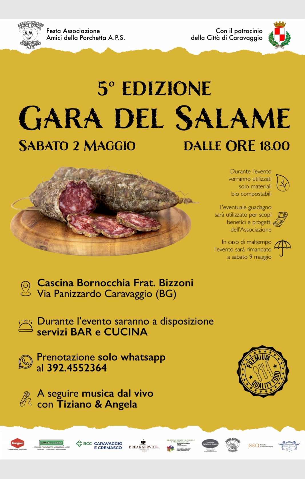 L'Associazione Amici della Porchetta, con il patrocinio della Città di Caravaggio, organizza la 5a edizione della Gara del salame che si terrà presso la Cascina Bornocchia di Via Panizzardo a partire dalle ore 18:00 di sabato 2 maggio.